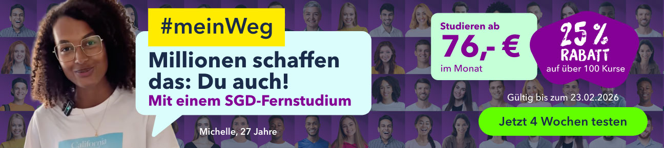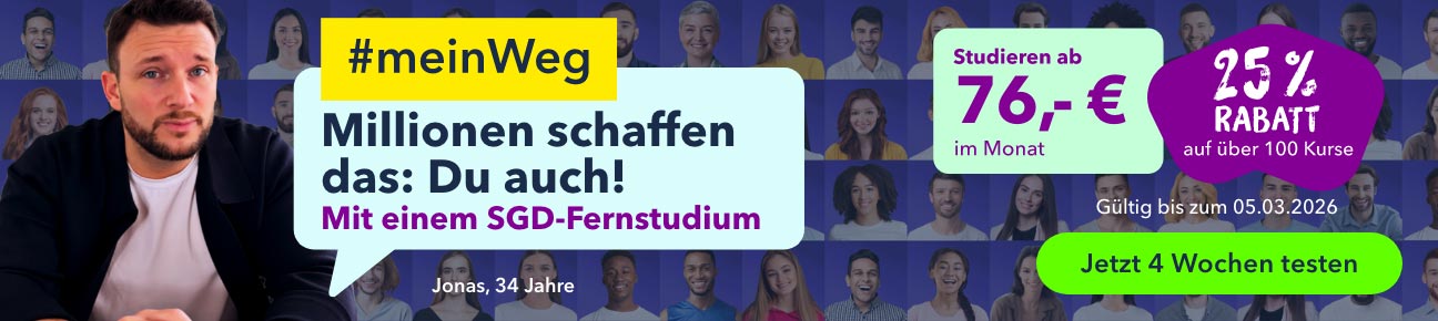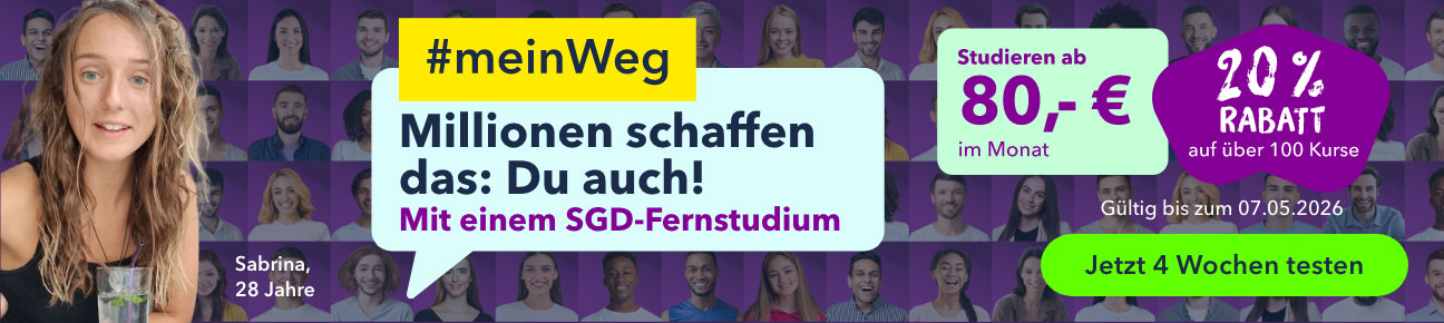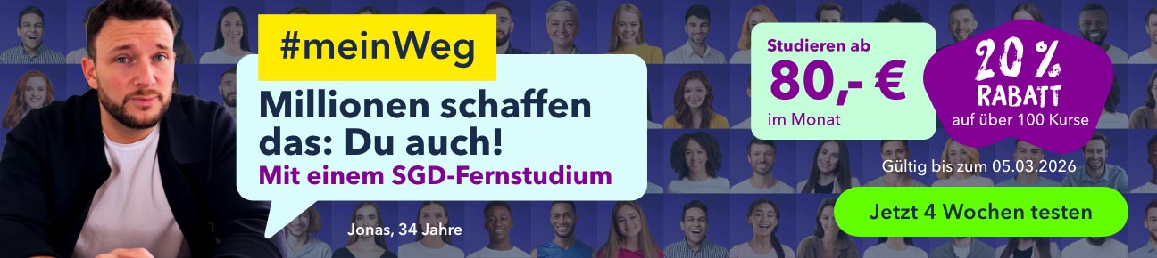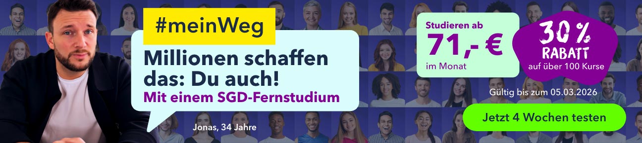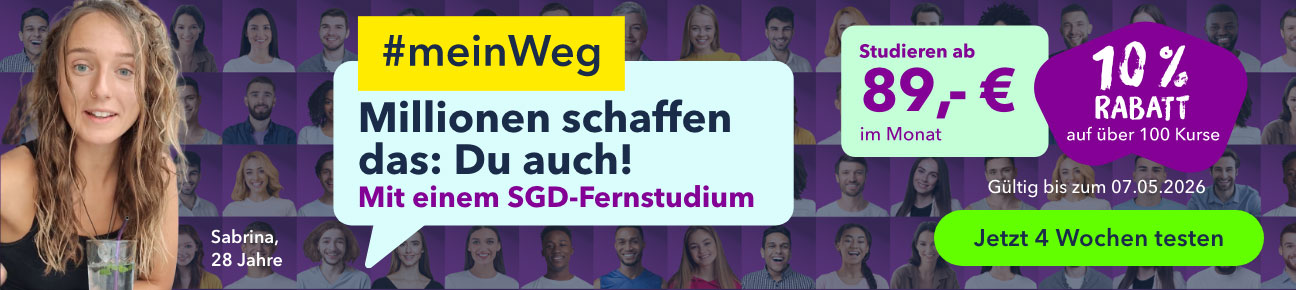 Bei der SGD können Sie sich neben dem Beruf in unterschiedlichsten Themen und Fächern weiterbilden. Hierbei ist unsere offene Einstellung gegenüber Ihren persönlichen Alltagssituationen einer der Vorteile, der die SGD zu Deutschlands führender Fernschule gemacht hat. Offenheit, Innovation und Qualität sind die Säulen unseres Fernstudienangebots. So können Sie bei der sgd Lerninhalte angepasst an Ihre Zeiteinteilung erschließen und unseren mehrfach ausgezeichneten Service sowie moderne Lernkonzepte von jedem Standort in Anspruch zu nehmen. Darüber hinaus können Sie in einem Fernlehrgang selbstbestimmt lernen und sich als aktiver Teil einer deutschlandweiten Gemeinschaft von Fernlernern und Fernlernerinnen einbringen. Über unsere SGD-Campus-App ist ein Kontakt und Austausch mit anderen SGD-Fernlernern einfach möglich. Sie werden merken, wie viel Freude es Ihnen bereitet, im Fernstudium spannende Themen für sich zu entdecken und so Ihren beruflichen Erfolg zu befördern.