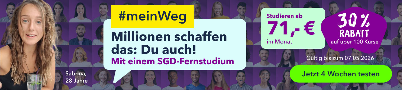 Die SGD, Deutschlands führende Fernschule, wünscht Ihnen viel Spaß und Erfolg in Ihrem Fernstudium!